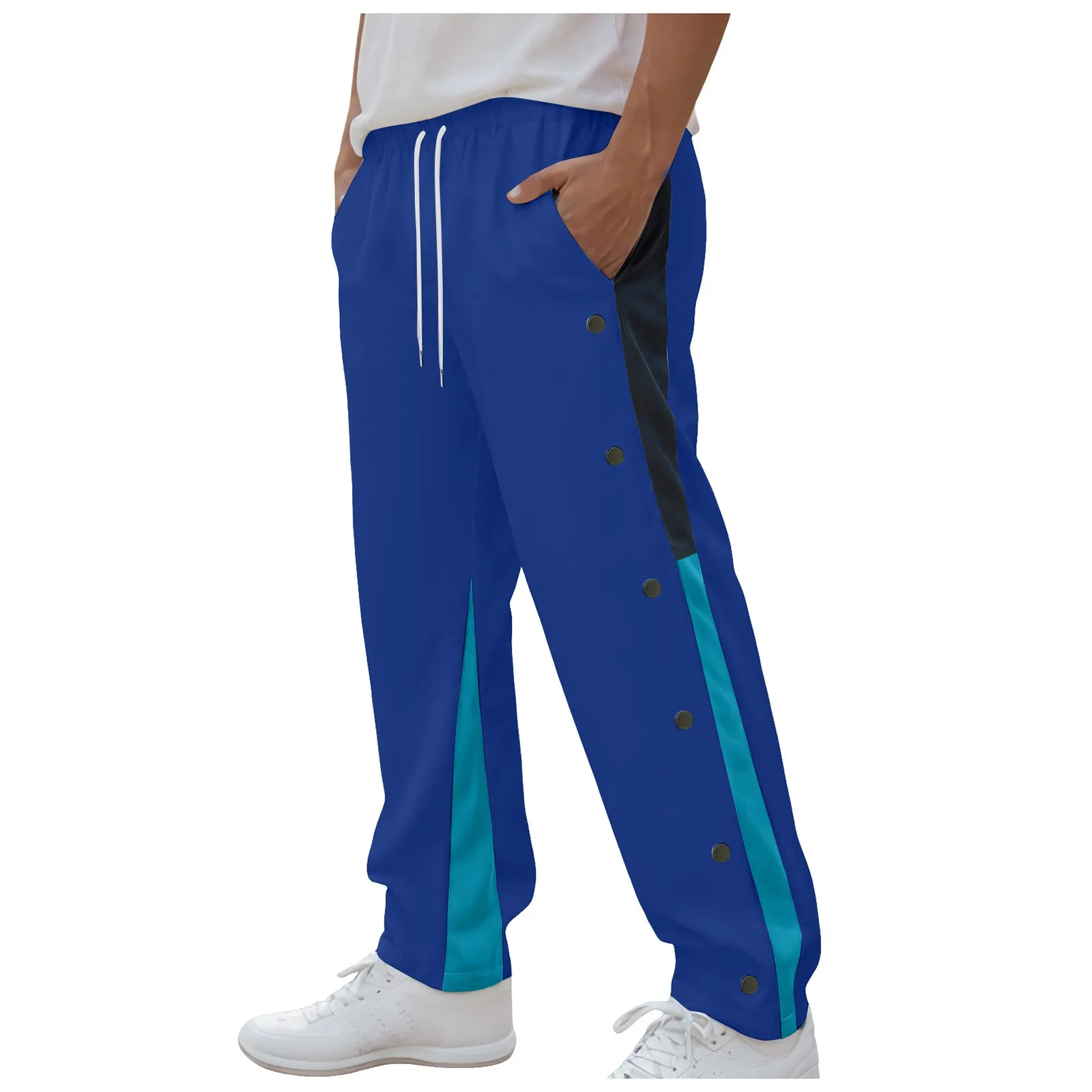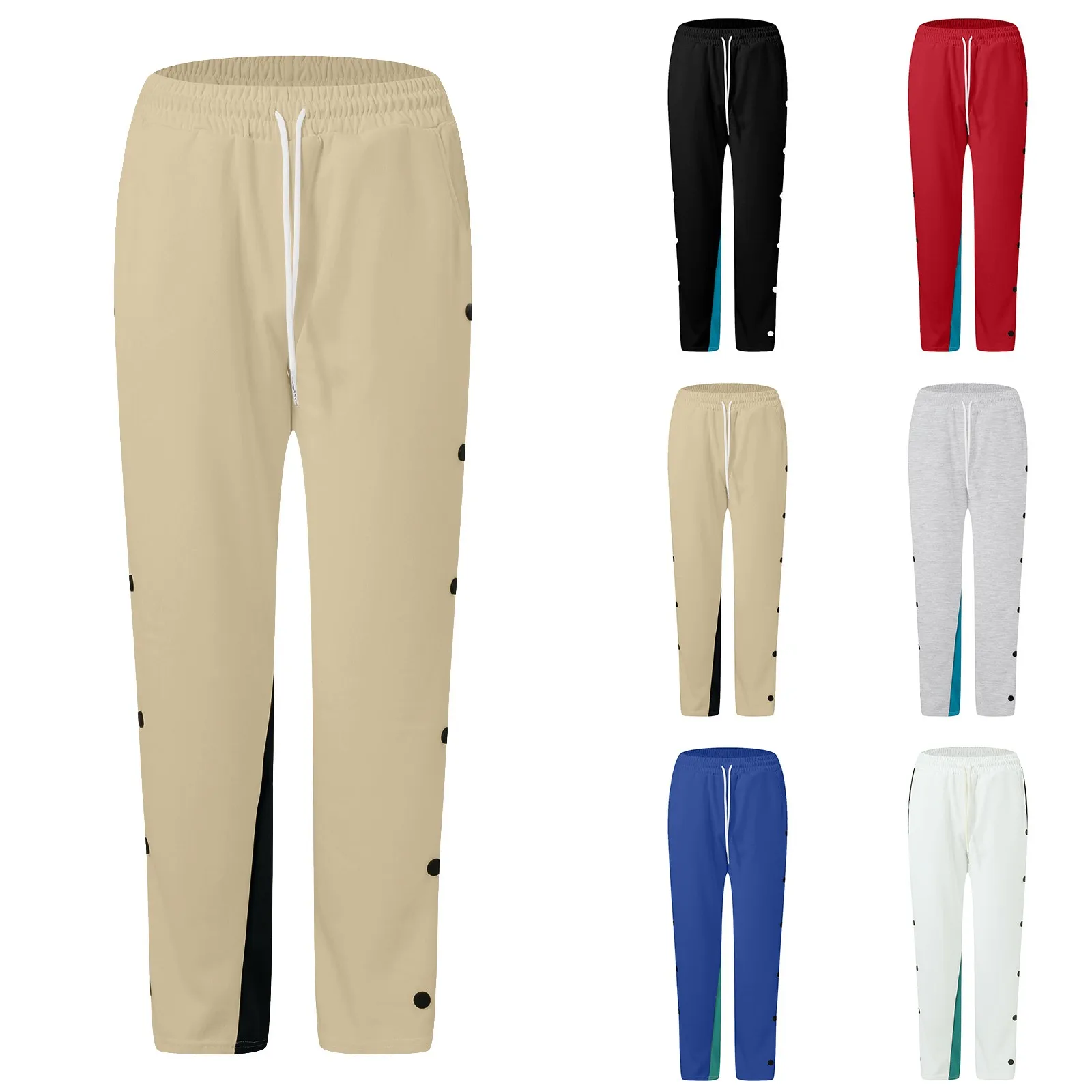 Men Fashion Color Block Casual Pants Comfortable Side Button Down Elastic Waist Drawstring Pocket Street Trendy Casual Bottoms